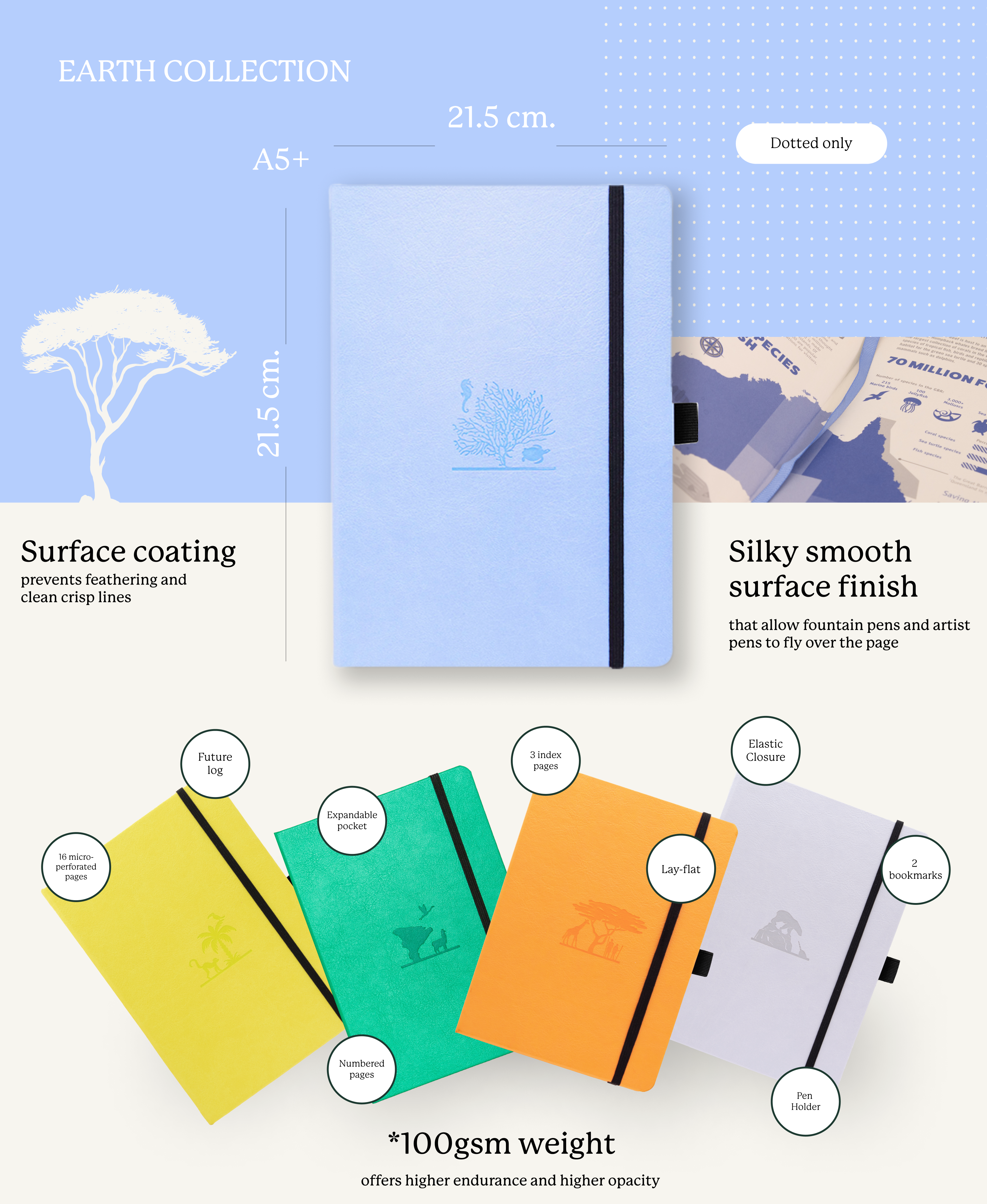 With a Dingbats*, you’re always carrying quality. We grew out of the oldest established paper company in Lebanon, so we have five generations of experience in doing things right. Each page of your Dingbats* is 100gsm cream coated, acid-free and totally fountain pen friendly. With FSC® (FSC-C105099) certified paper that adds up to 96 sheets in total, or 192 pages for those who of you need a little extra creative space, you can scribble, doodle, journal and jot down your ideas and notes for years to come, as longevity, preservation and care always come first for Dingbats*. The Earth collection has 184 numbered pages where the last 16 are micro-perforated