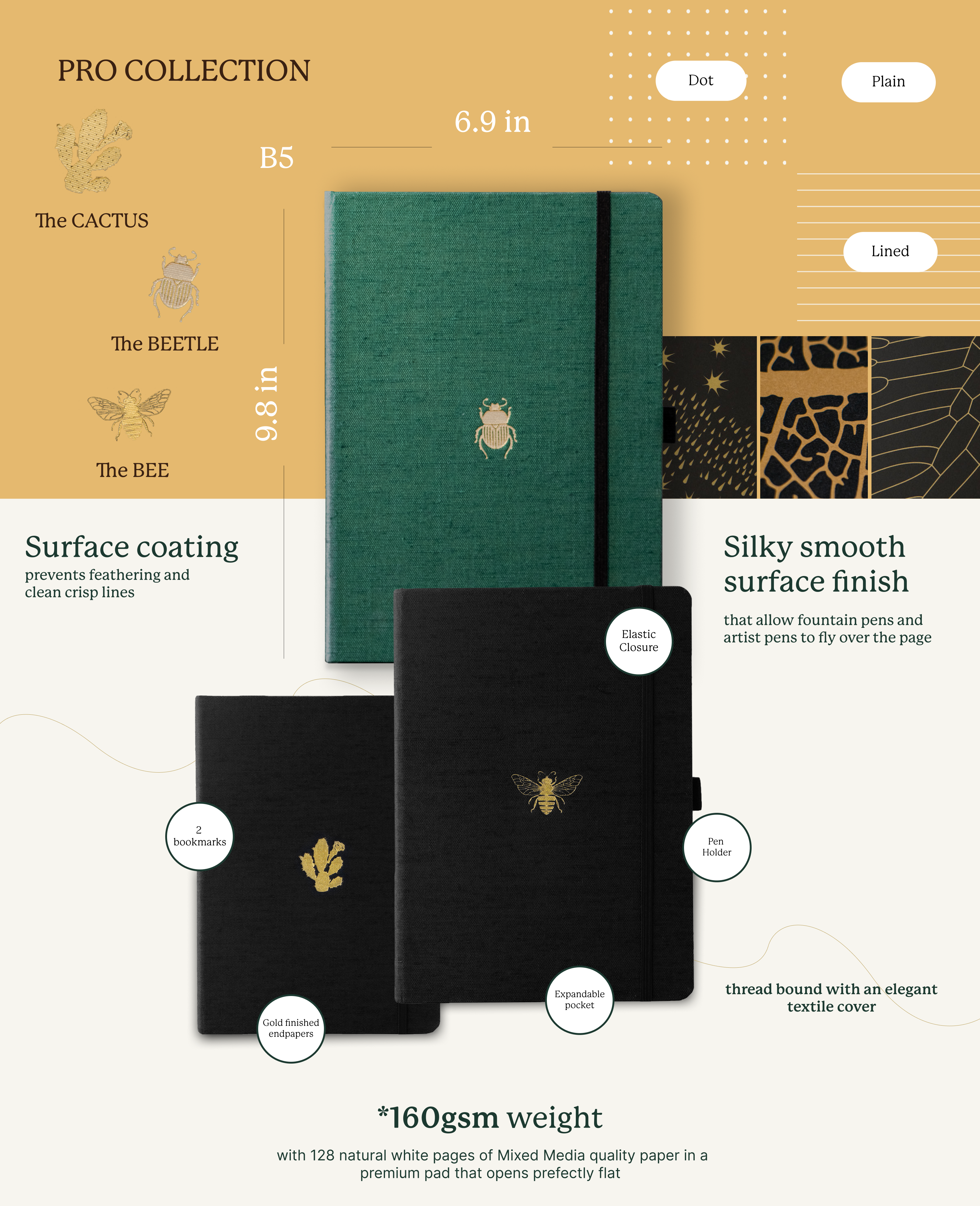 Our exclusive Dingbats* Pro Collection draws on 5-generations of experience in the craft of high-quality paper-making to bring you a premium notebook like no other. In line with our profound passion for nature, this collection comes with a choice of two debossed motifs, the Dingbat* Bee and the Dingbat* Cactus.